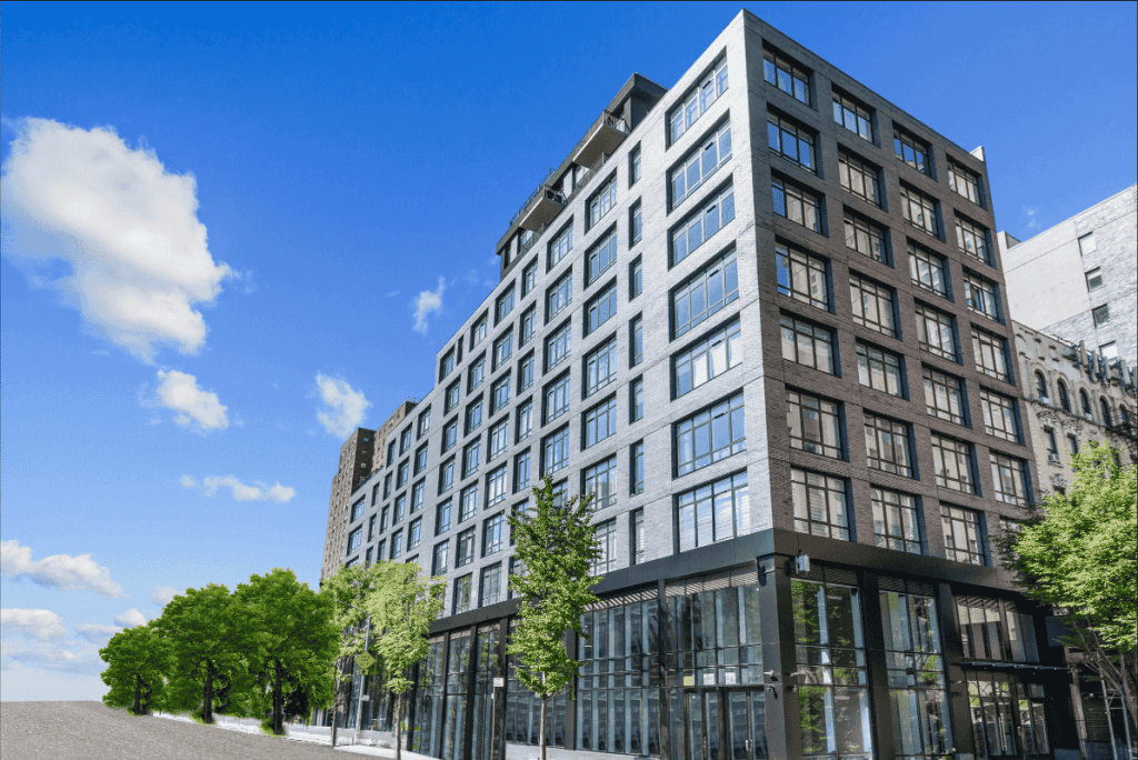 A modern, multi-story building with large windows stands on a city street. The ground floor features a retail space for lease with an orange sign displaying contact information. A tree-lined sidewalk and a streetlight with a traffic signal complete the urban scene.