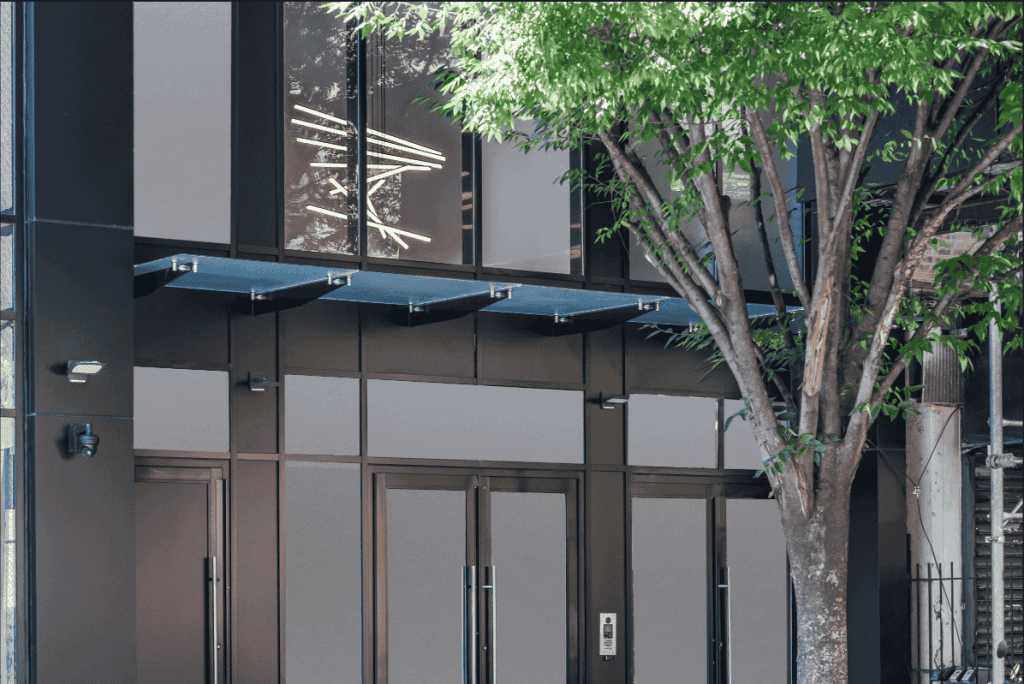 A street view of a multi-story building with large glass windows on the lower level and a dark exterior facade. Signs in the windows advertise retail space for lease. The clean sidewalk, lined with trees, features a pedestrian crosswalk.
