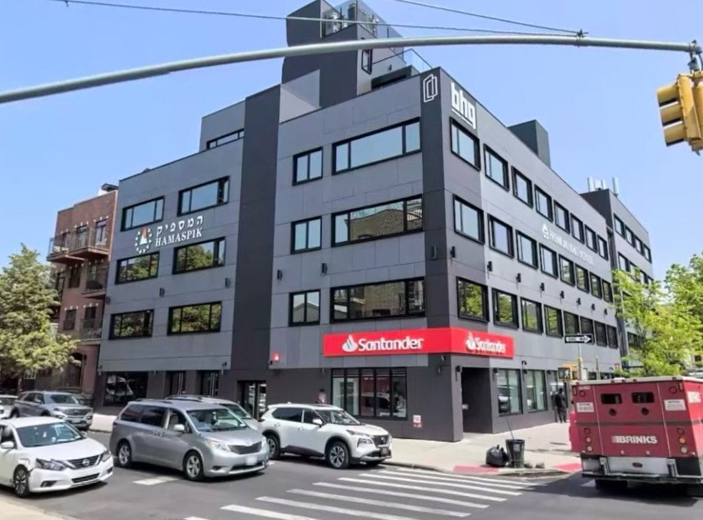 A multi-story black building with Santander and BGC logos on the facade. Ground floor windows display the Santander logo with a red sign. A Brinks armored truck is parked on the street next to a silver SUV and a pedestrian, all under a clear, sunny sky.