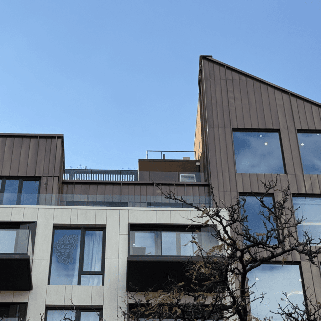 Aerial view of a cityscape featuring a mid-rise residential building in the foreground with a mix of older buildings, trees, and various unique architectural styles in the background. The landscape extends towards the horizon under a clear blue sky.