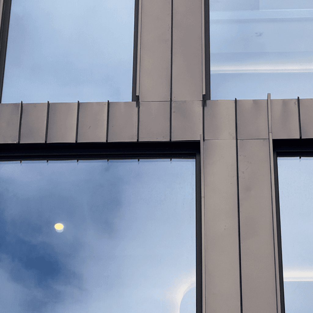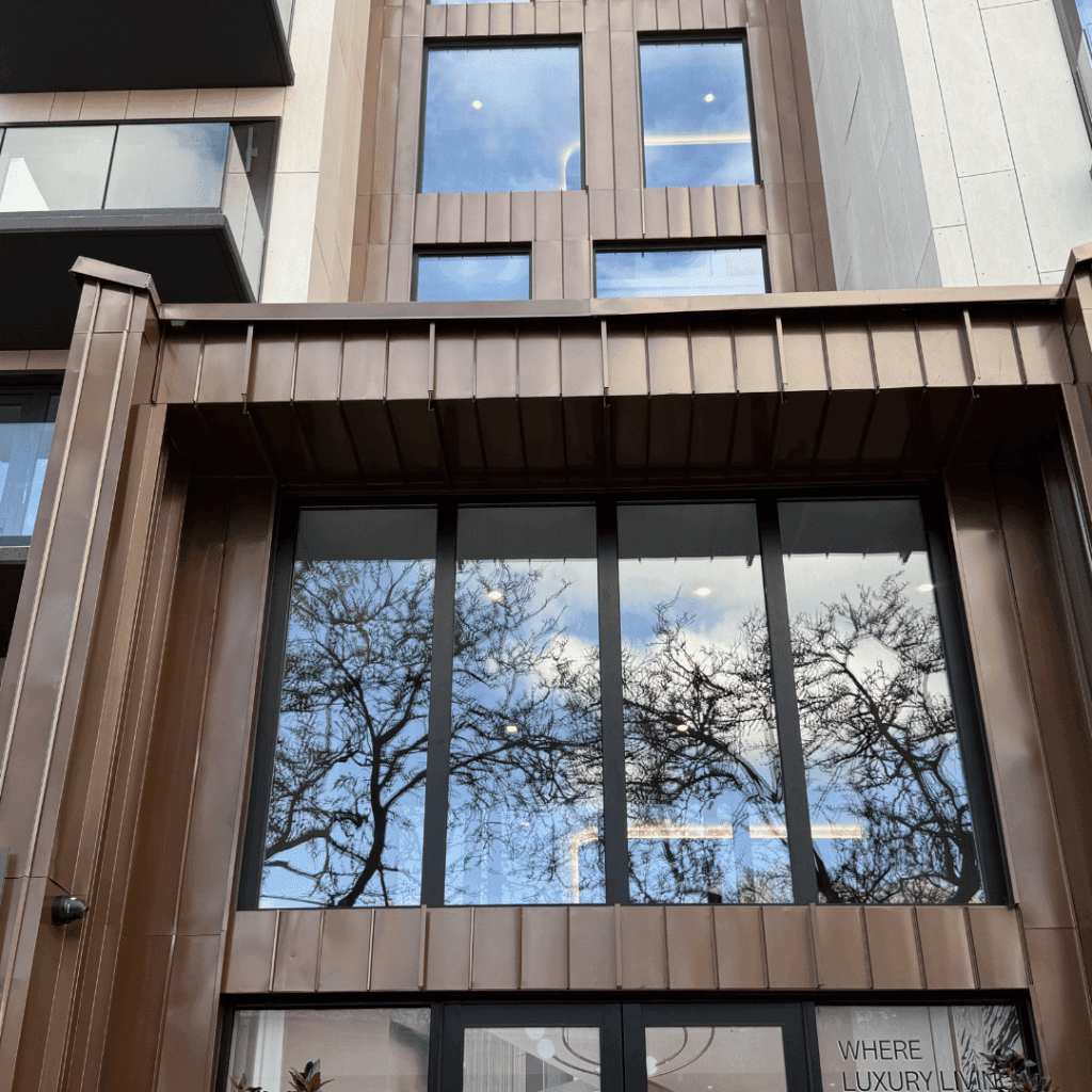 A modern, multi-story rooftop with unique architecture featuring angular design elements, a gray and white exterior, expansive glass windows, tiered platforms, and glass railings. The background shows a cityscape under a clear blue sky.