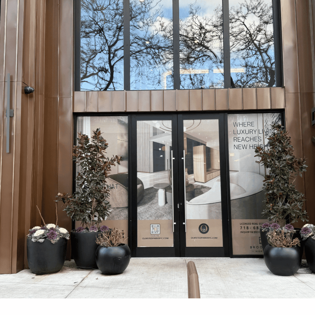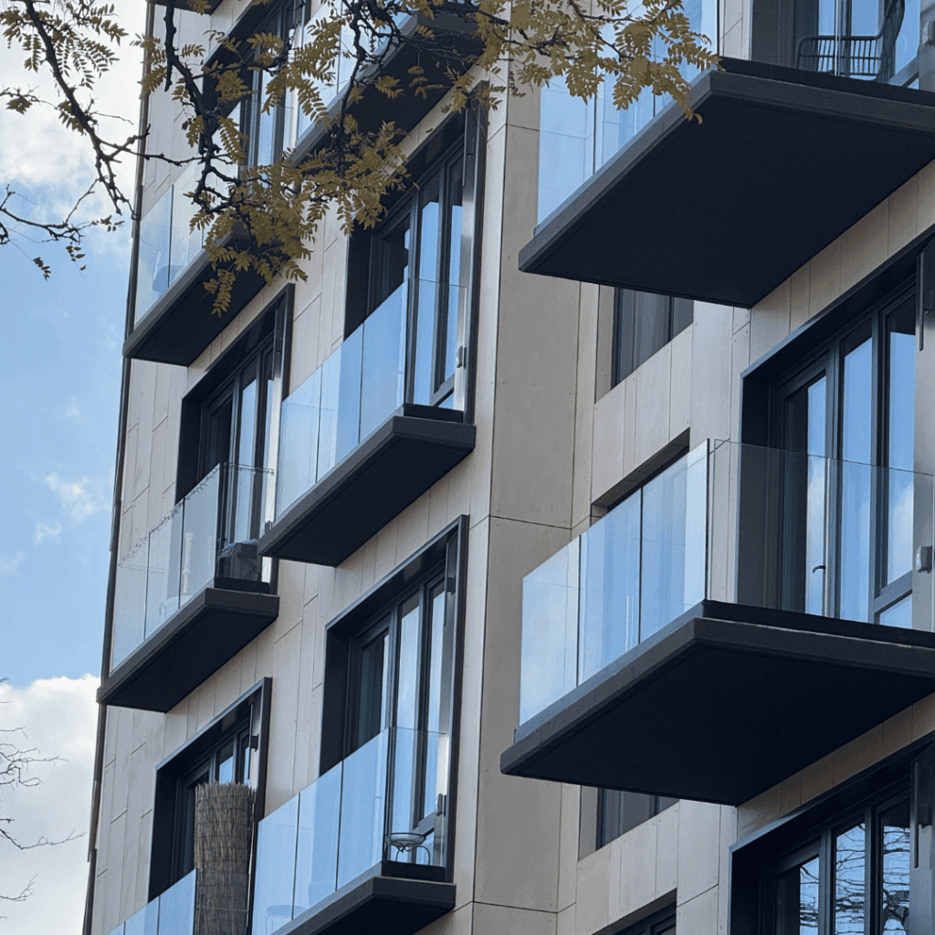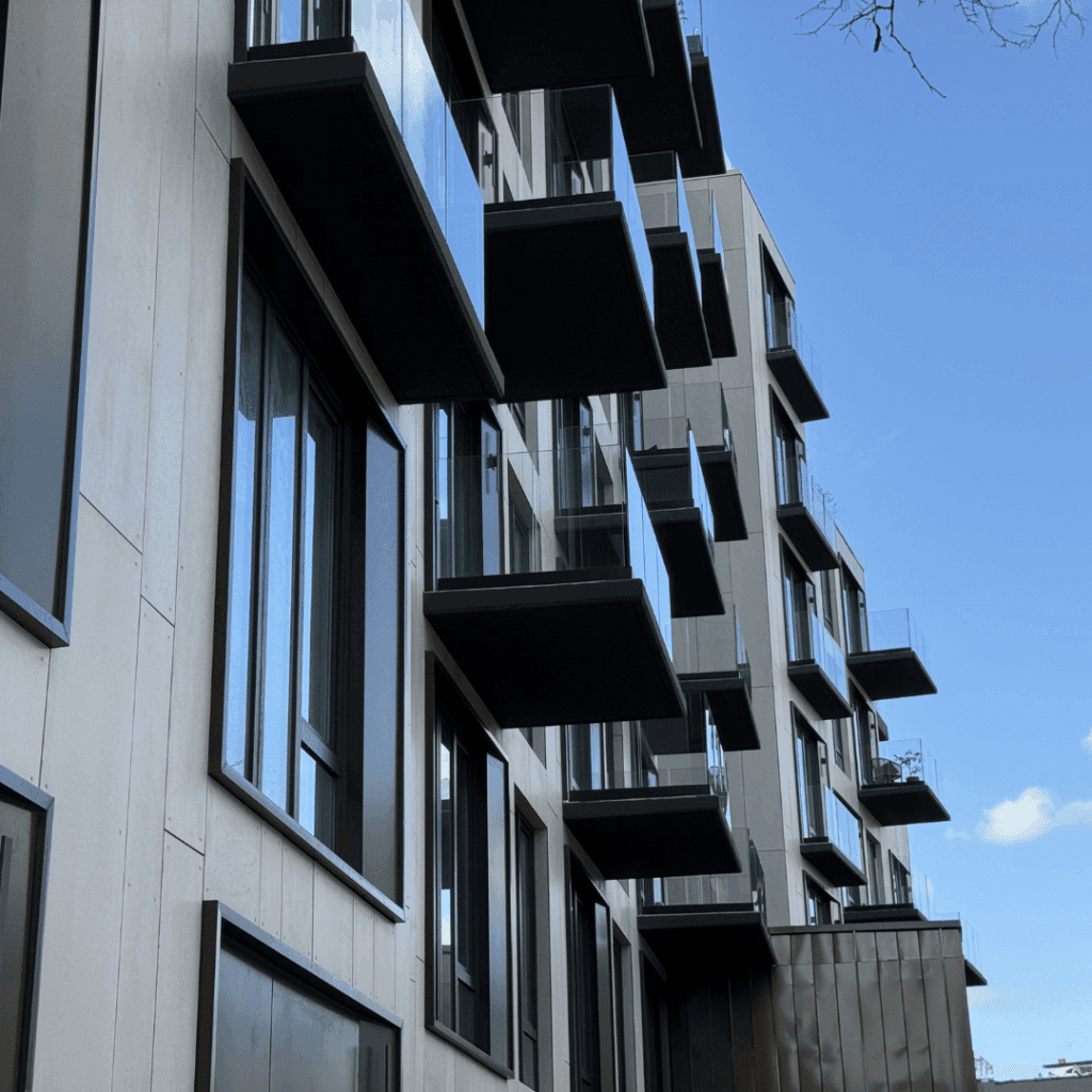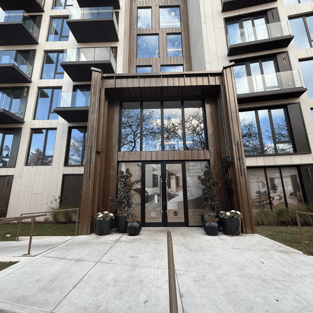An aerial view of a city neighborhood showcases a modern multi-story apartment building with large balconies. The building is surrounded by smaller structures and tree-lined streets, with a sprawling green park visible in the background under a clear blue sky, presenting an idyllic urban setting.
