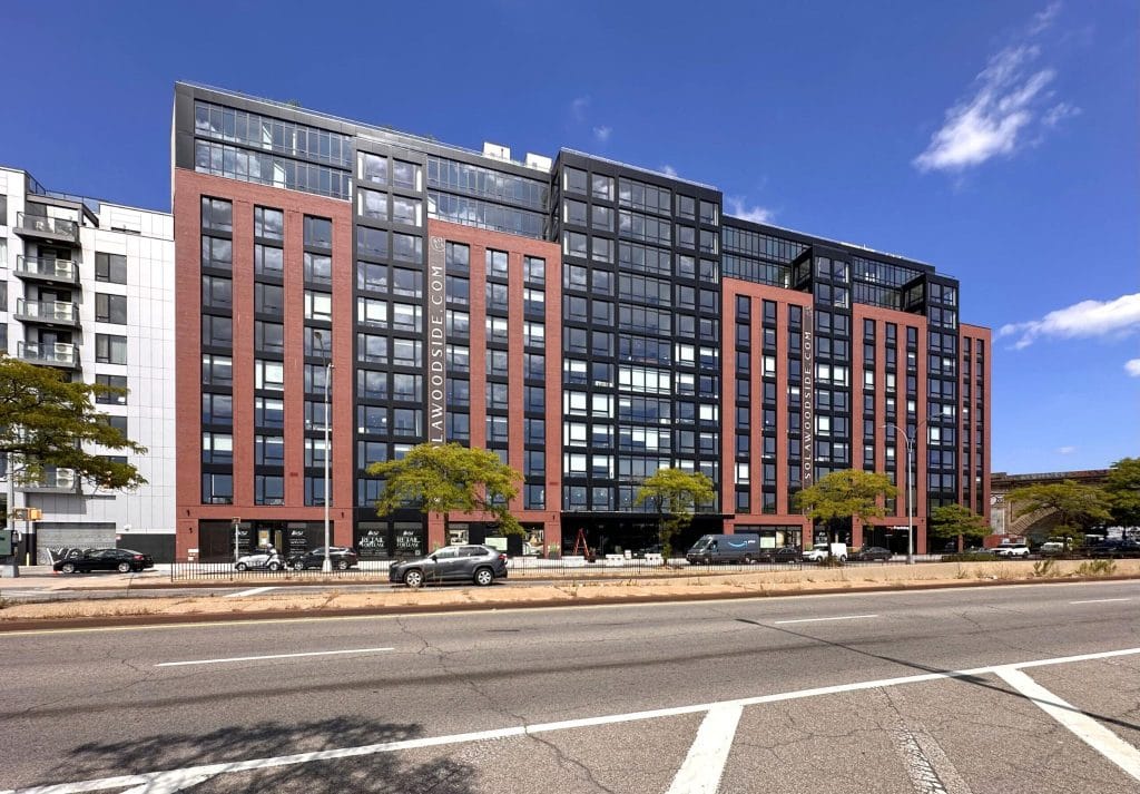 A row of modern apartment buildings with a sleek, glassy exterior featuring standing seam details. Trees line the street in front, and various vehicles are parked alongside the buildings on a clear, sunny day.
